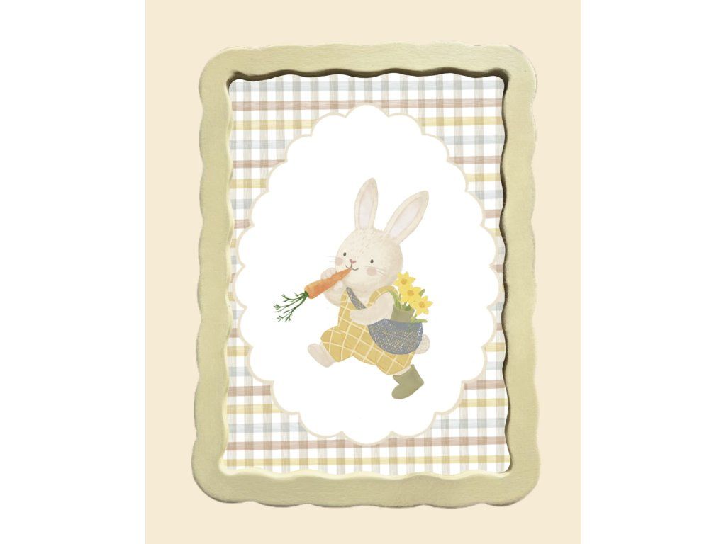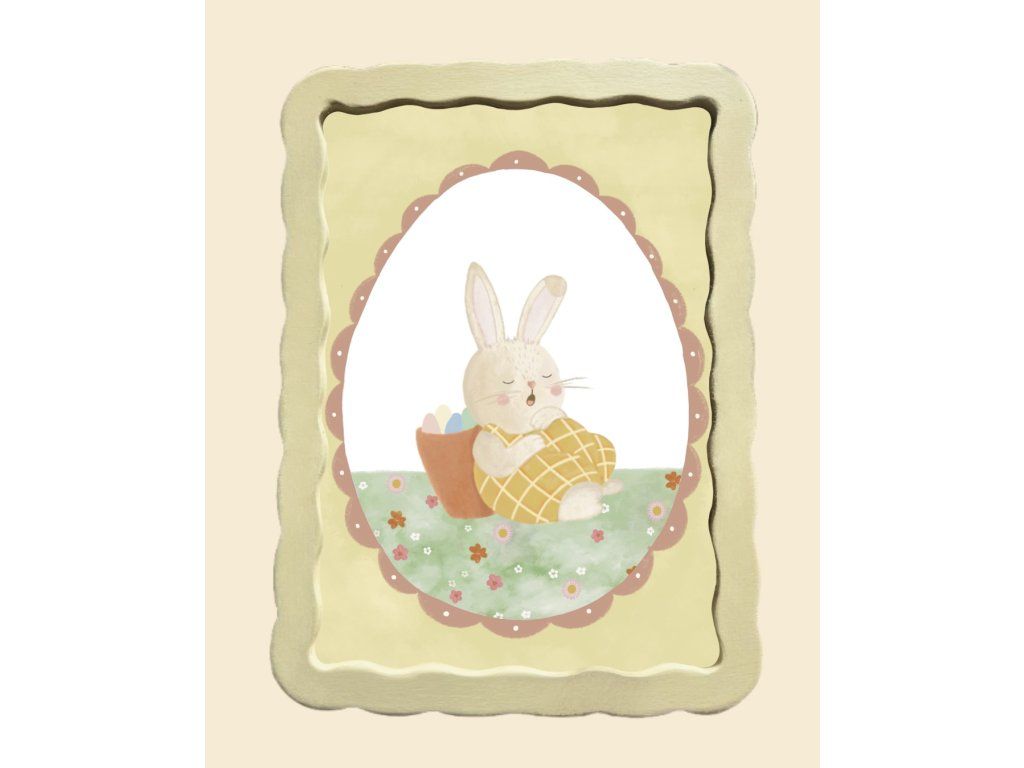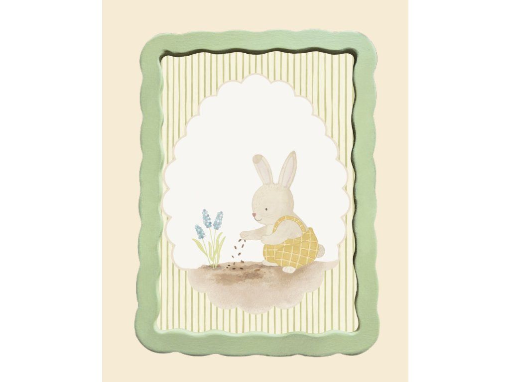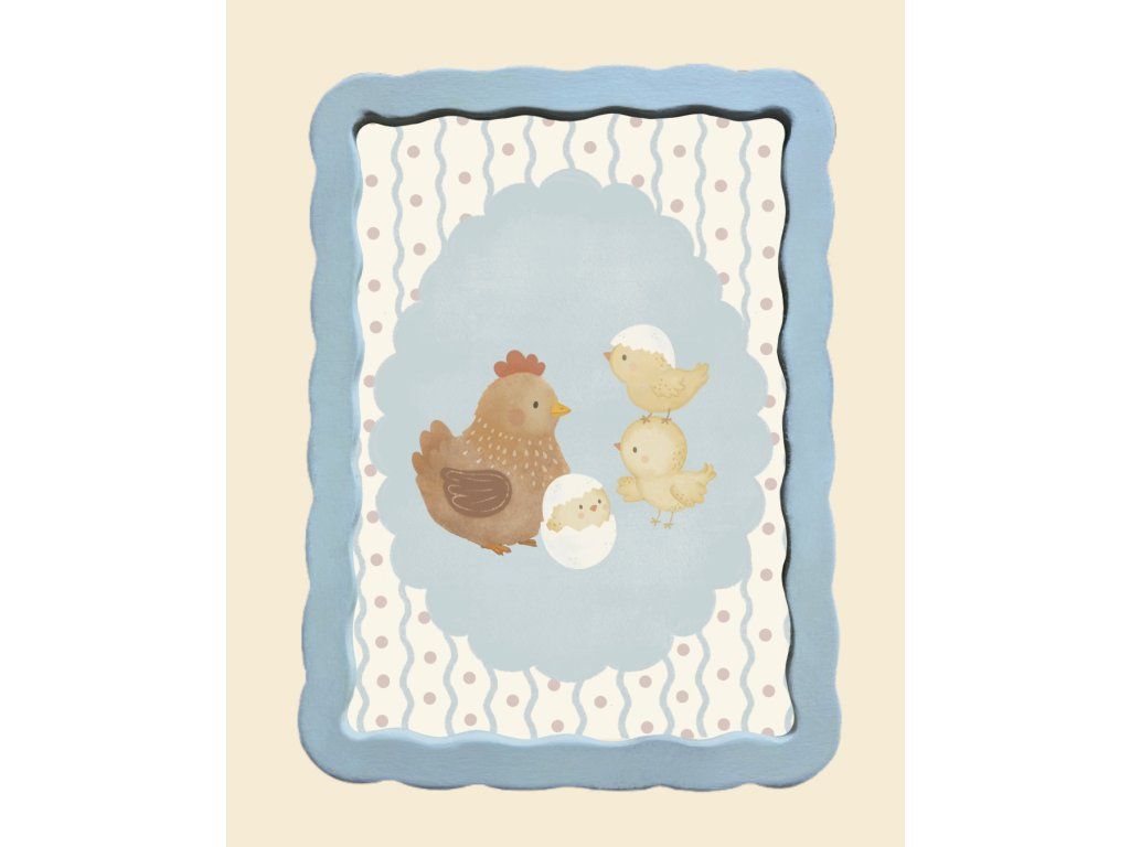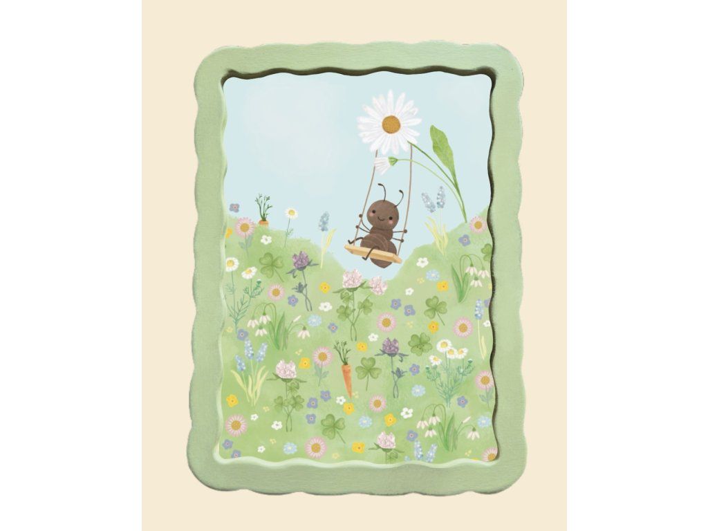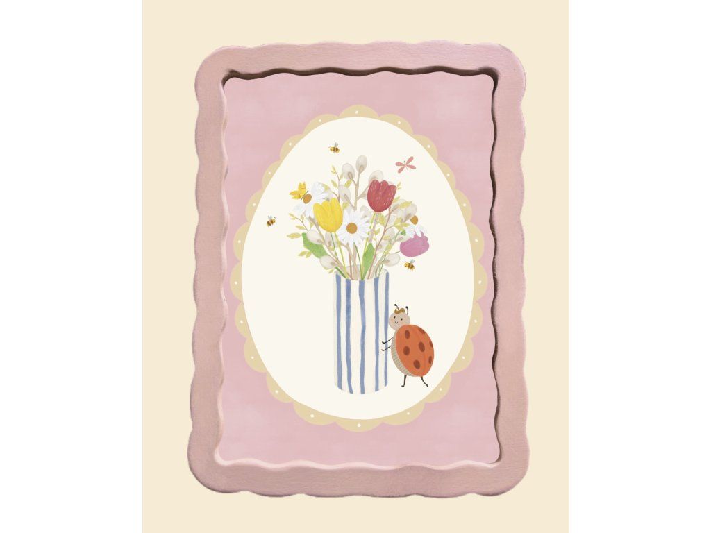Autorská ilustrace inspirovaná jarem, přírodou a dětským světem, zasazená do ručně vyráběného dřevěného rámečku.