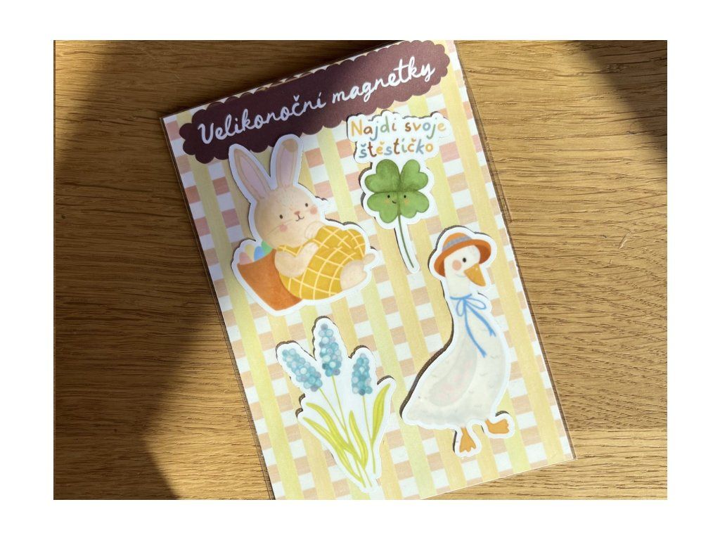 Autorské velikonoční magnetky s ilustracemi zajíčka, husy, modřence a čtyřlístku.